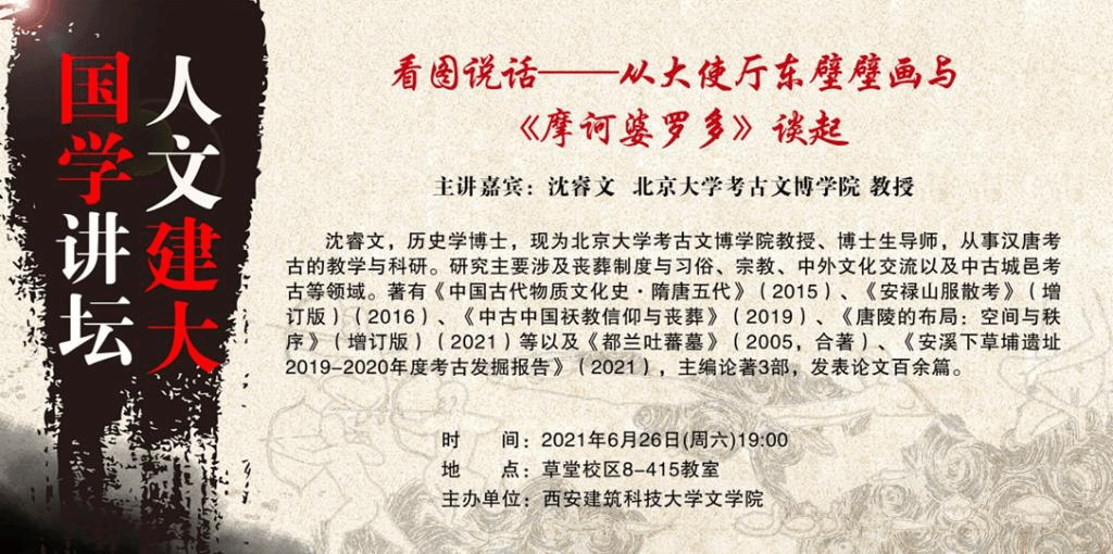 Ray竞技官网网讯(通讯员:金艳芝)2021年6月26日晚,由我们Ray竞技官网主办,Ray竞技官网中文系承办的“人文建大,国学讲坛”系列学术讲座迎来又一位名家。北京大学考古文博学院沈睿文教授应邀来到草堂校区,为我们部分研究生及本科生主讲了“看图说话——从大使厅东壁壁画与《摩诃婆罗多》谈起”的专题讲座。此次讲座由Ray竞技官网中文系孙武军老师主持。