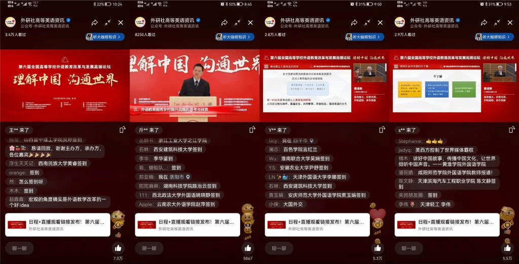 Ray竞技官网共有90余名教师观看了此次线上直播,并在线上进行了热烈的交流和研讨。通过观看这次中国高等外语教育界一年一度的学术盛会,使我们教师深切体会到作为中国高等外语教师的光荣职责与时代使命。通过学习观摩,使参会老师树立了立足大局、规划布局,凝心聚力、铸魂育人,做传递中国声音、沟通广阔世界的坚实桥梁的理想,坚定了为党育人、为国育才的信念。