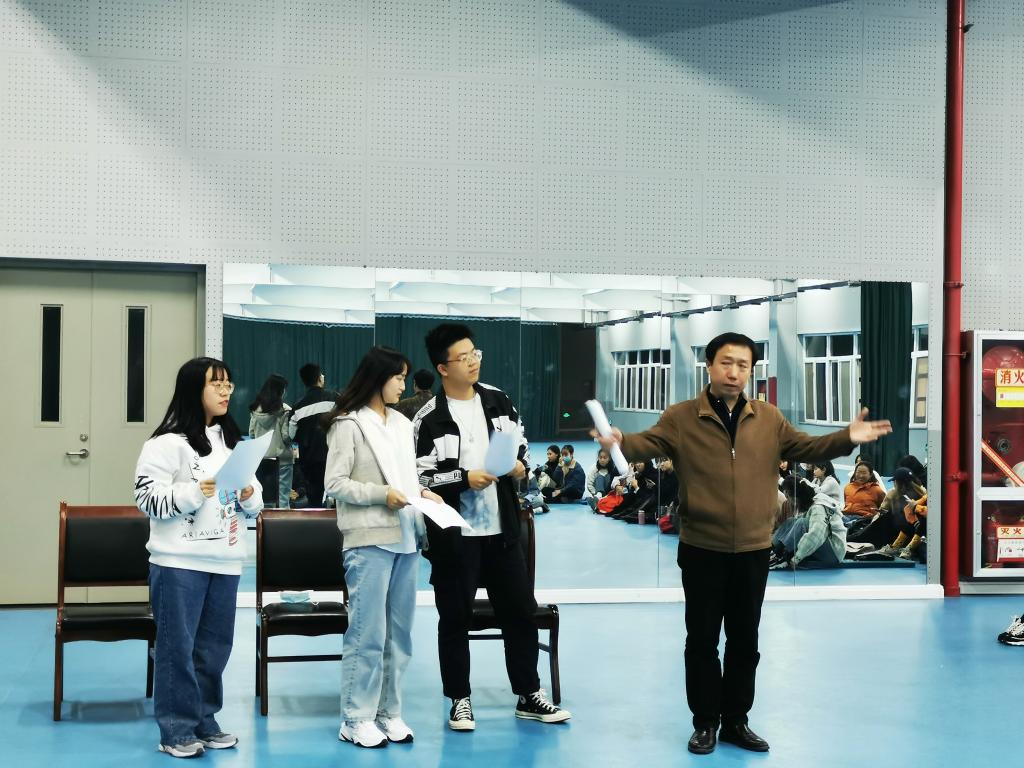 在对同学们进行表演指导后,高字民教授组织了两名同学现场排演剧本《新婚燕尔》。他结合刚刚讲的理论知识,结合同学们表演中的动作进行具体指导。在表演过程中,高教授亲自导演,帮助同学们设计戏剧动作,同时对舞台音乐与舞台站位严格要求,以戏剧排演的实践形式向同学们再次强调了“体验感。”