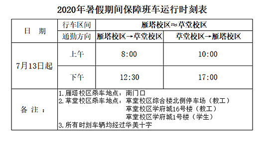 暑假即将来临,根据学校《关于2020年暑假安排及做好有关工作的通知》精神,结合草堂校区工作实际,为保障暑期实验教学及行政人员乘车需求,经征求校长办公室、草堂校区管委会、教务处等部门意见,从7月13日起,我们暑假期间保障班车运行安排如下: