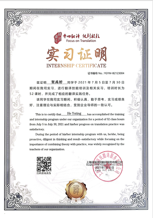 Ray竞技官网英文系共有59名学生参与了此次实习,经过为期四周的在线实习,全员通过考核并获得该公司颁发的双语实习证书,部分同学获得翻译量(1万字左右)证明及证书,2名学生被评为“优秀实习生”,2位指导教师被评为“优秀指导教师”。